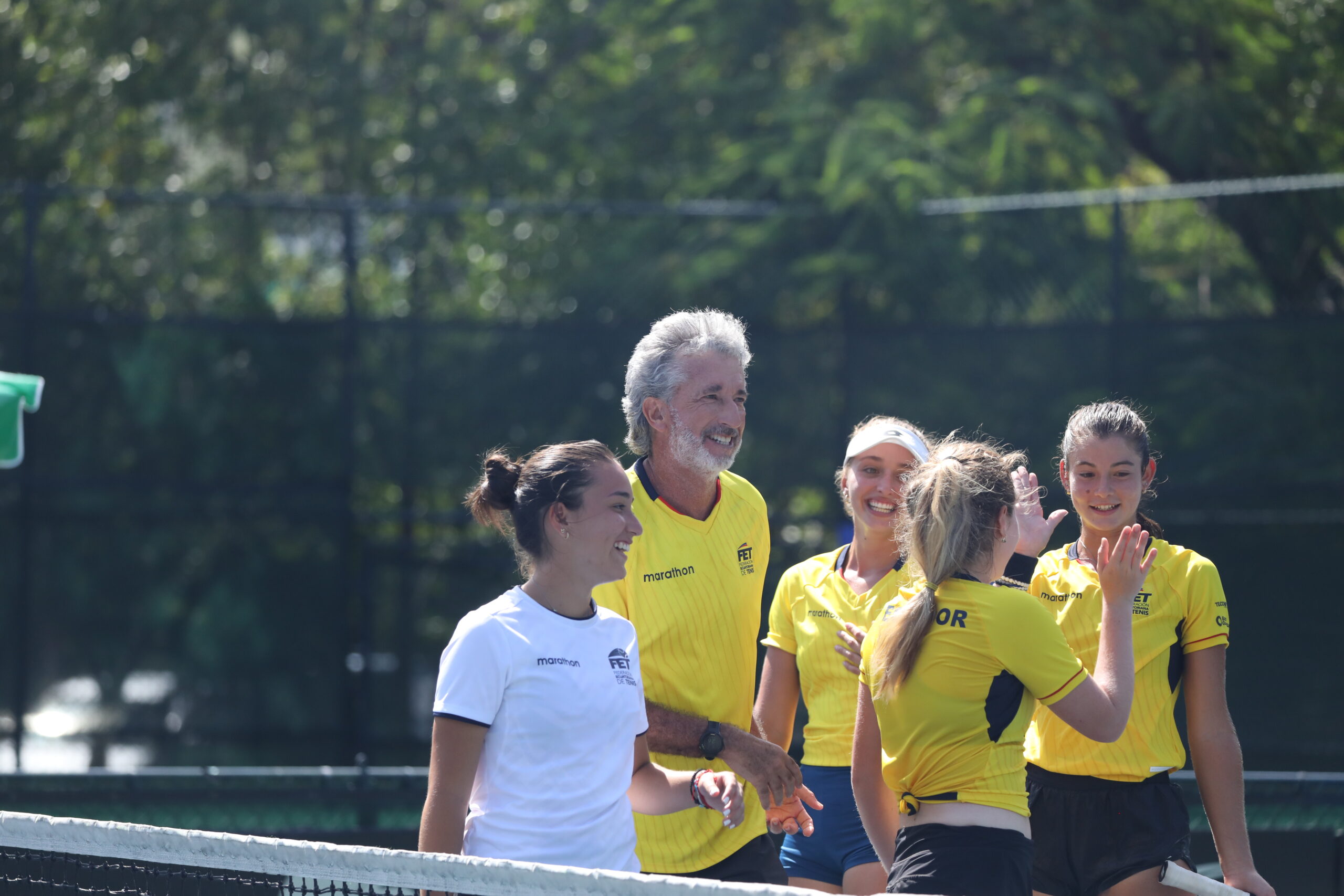 Los jugadores Emilio Camacho, Jaime Robles y Sergio Castro, el capitán Diego Velástegui y el entrenador y delegado Emilio Gómez practican a doble jornada esta semana en las instalaciones del Guayaquil Tenis Club sede Anexo Samborondón, junto a otros destacados juveniles como Francisco Castro, Lucas Yúnez y Ángel Véliz.