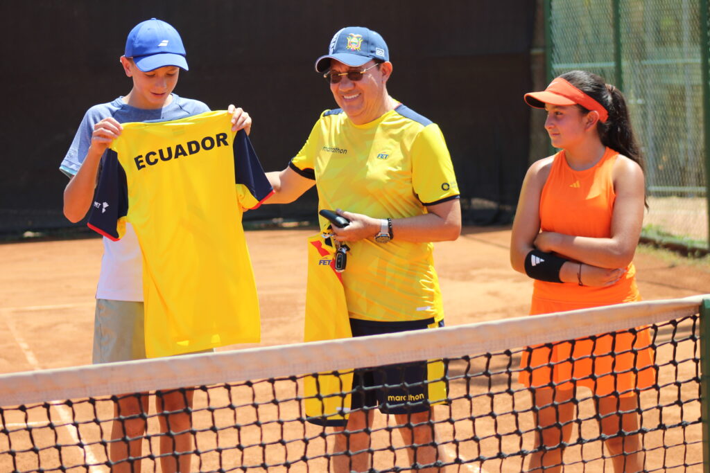 El presidente de la FET, Patricio Galarza, entrega las camisetas del equipo ecuatoriano a Espinoza y Arias.